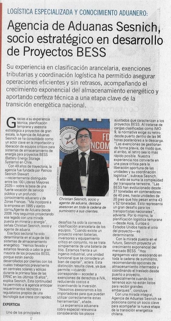 La logística especializada y el conocimiento aduanero son hoy pilares clave para el desarrollo de proyectos BESS en Chile. En este contexto, Agencia de Aduanas Patricio Sesnich Stewart y Cia. Ltda. se ha consolidado como un socio estratégico, aportando experiencia en clasificación arancelaria, exenciones tributarias y coordinación logística integral.